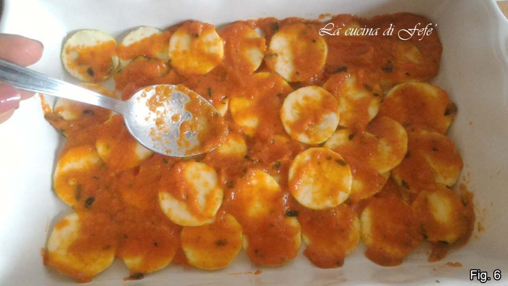 • Start assembling the parmigiana by putting a drizzle of oil and 2 tablespoons of water on the base of a baking dish to create the right humidity. Create the first layer of zucchini.