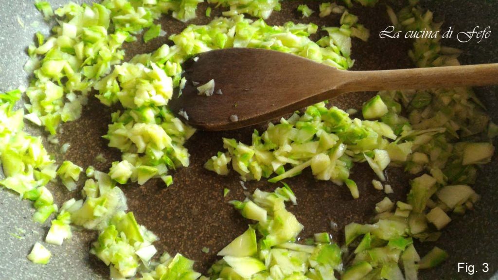 In a nonstick pan, brown the garlic with a drizzle of oil and 2 tablespoons of water for 1′. Once it starts to sizzle, add the chopped zucchini and lower the heat, cooking covered for another 3′, adding a little water only if necessary (fig. 3).