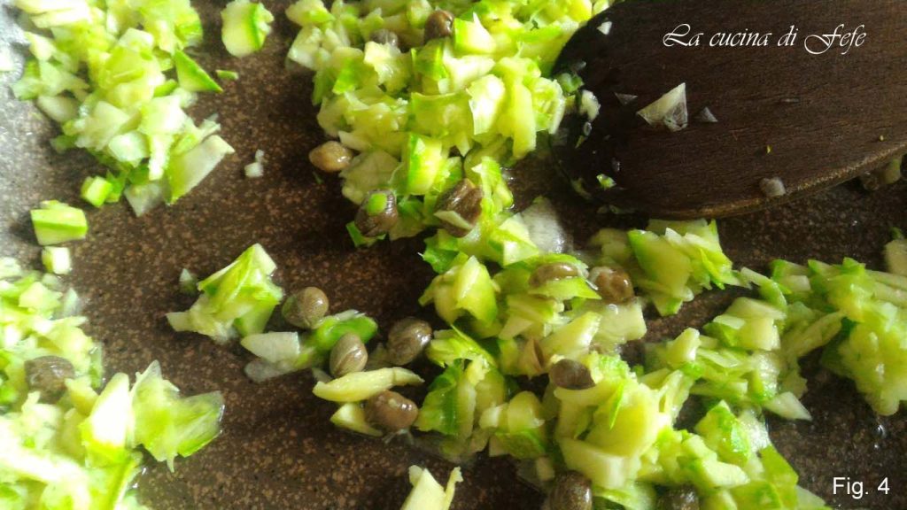 Desalt the capers under running water, squeeze them, and add them to the zucchini (fig. 4).