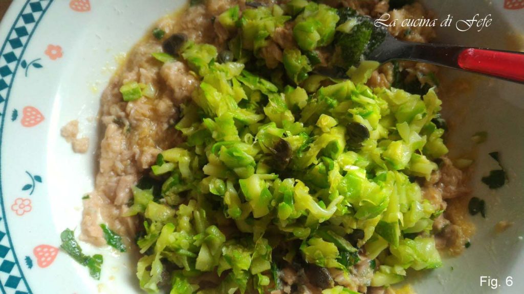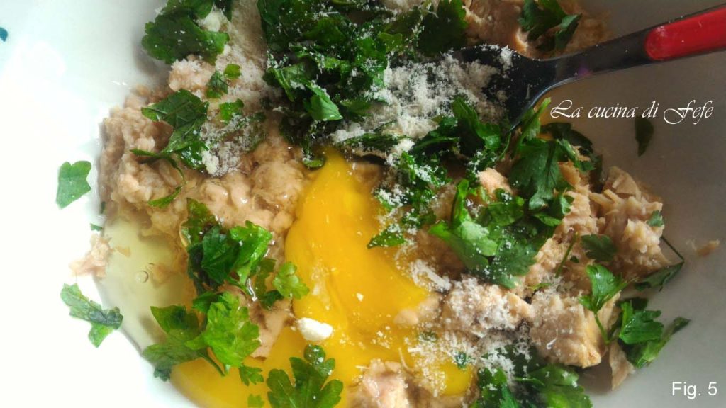 Cook for another 3′. Pepper and adjust salt if necessary. Meanwhile, in a bowl, mix the well-drained tuna fillets with the egg, the grated Parmesan, and the chopped aromatic herbs (fig. 5).