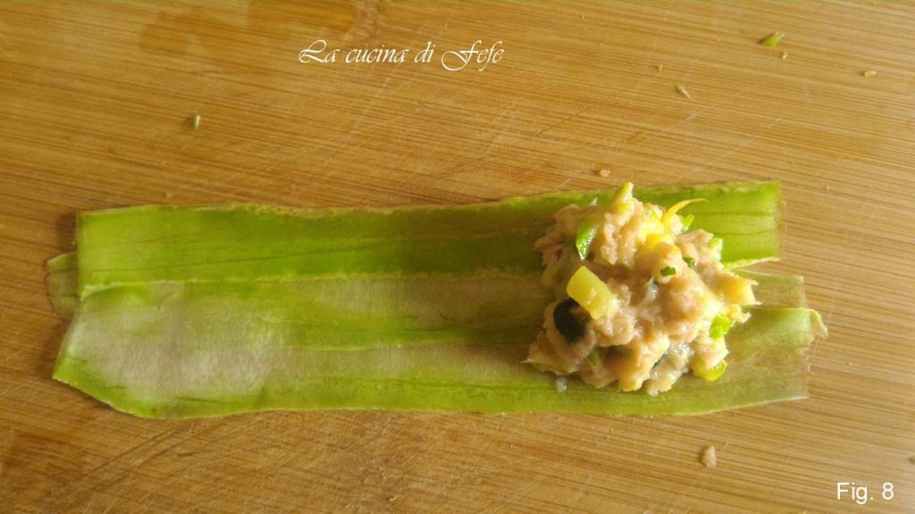 Take 2-3 zucchini ribbons, overlap them on a cutting board, and distribute a bit of this mixture on one end (fig. 8).