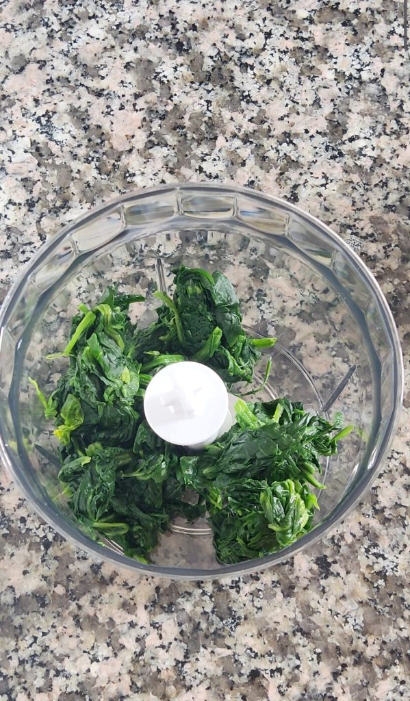 I used frozen spinach that I simply cooked in the microwave for 6 minutes at 750 W. You can also use fresh spinach. Transfer both the cooked spinach and the chicken breast (cut into small pieces) into a food processor or blender. Blend until combined.