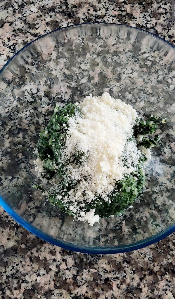 Continue by adding the grated Parmesan and about 1/4 cup (≈35 g / 1.25 oz) of breadcrumbs.