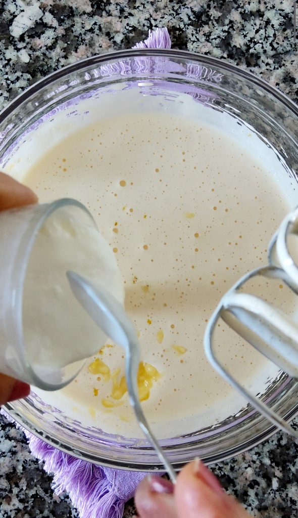 Add the grated zest of half an untreated lemon, melted butter, and a container of plain or blueberry yogurt. Mix.