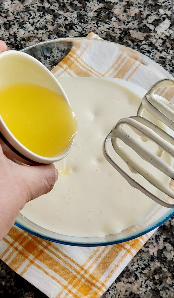 Finish the preparation by adding the sifted flour and baking powder. Mix.