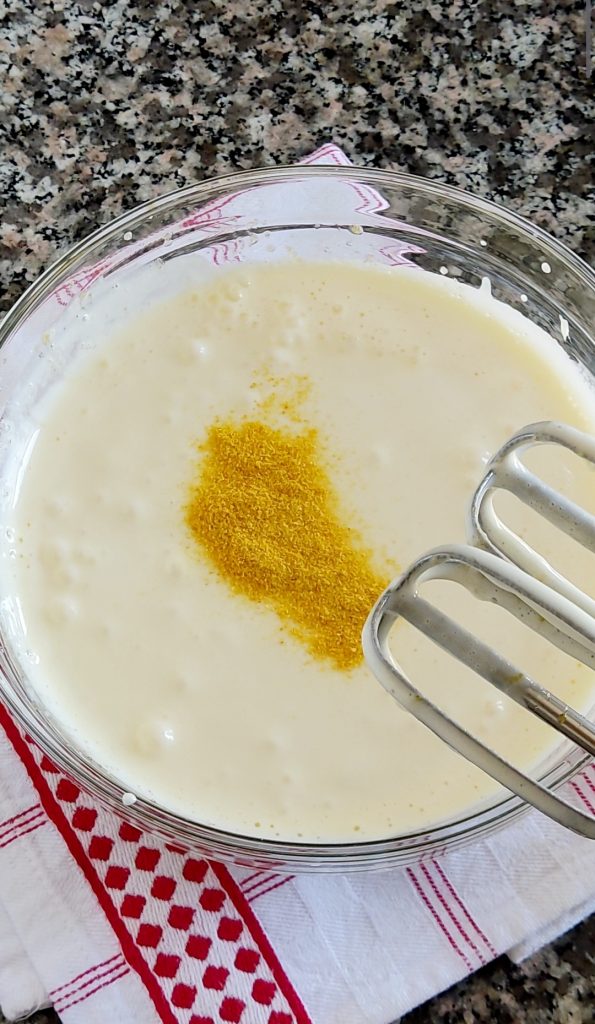 Beat the 2 whole eggs with the sugar using an electric mixer for 6-7 minutes until you have a light and fluffy mixture. Add the cream and mix.