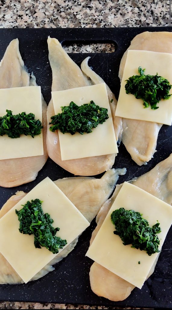 To prepare this recipe you need thin slices of chicken breast. If they are not thin enough, further thin them out with a meat mallet. For the spinach, you can use either fresh or frozen spinach boiled in a little water or cooked in the microwave.