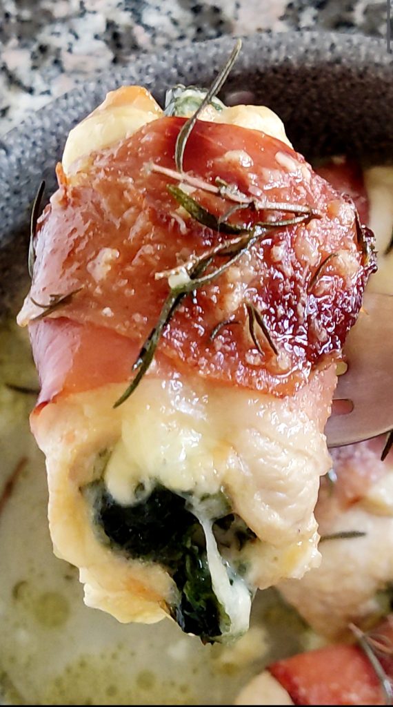 Cook the Chicken with spinach and speck in the preheated oven at 375°F for 20 minutes. If you prefer, you can cook them in the air fryer at 375°F for 14-15 minutes. Serve them with Crispy Potatoes in a pan, and they will be perfect!