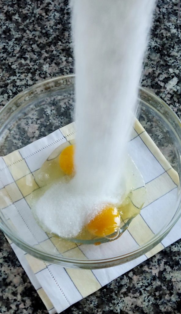 Beat the 2 whole eggs with the sugar using an electric beater for 7-8 minutes until the mixture is light and fluffy.