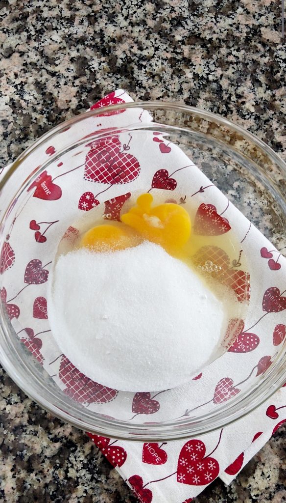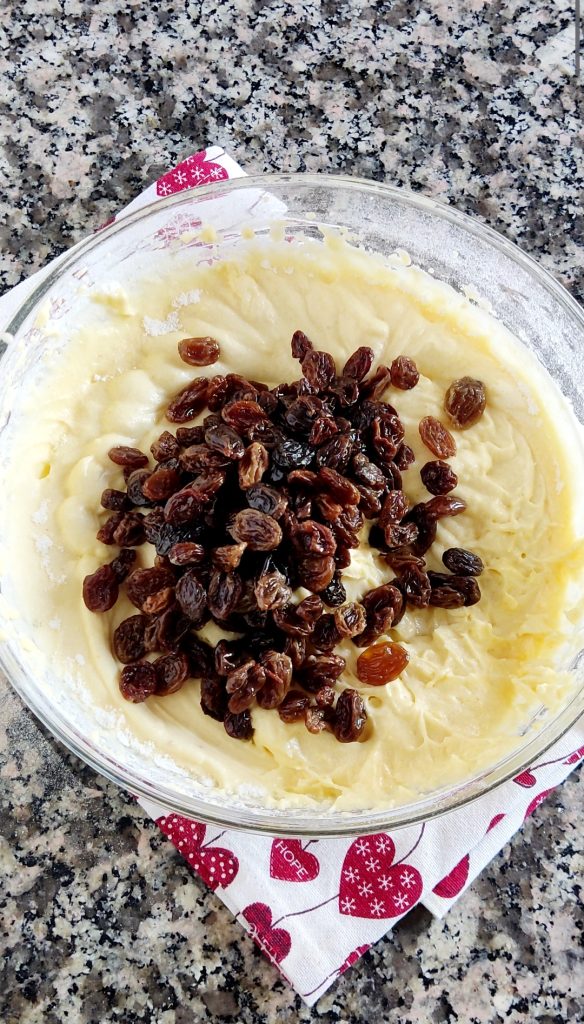 First, put the raisins in a small bowl with hot water to soften them. Beat the eggs with the sugar for 6-7 minutes using an electric mixer until the mixture is light and fluffy.