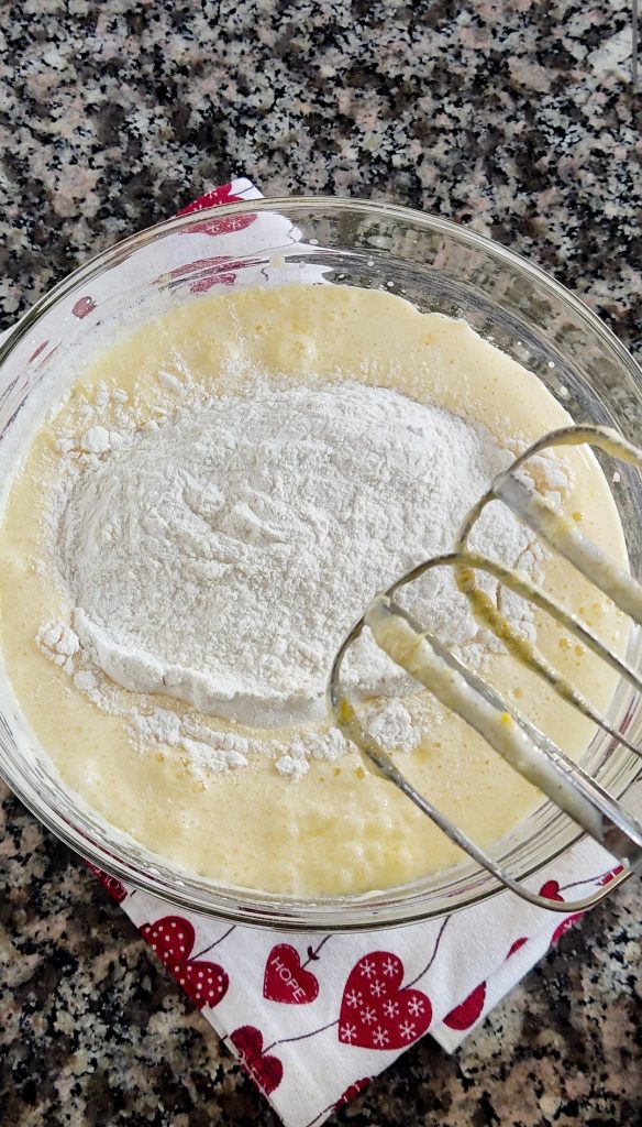 Now add the sifted flour, baking powder, and grated orange zest. Mix
