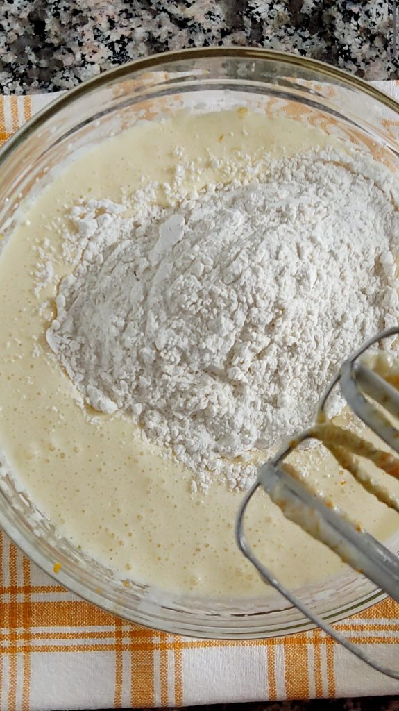 To prepare this dessert, you need an untreated orange to use its peel. Wash the orange well. Beat the 2 whole eggs with the sugar using an electric mixer for 7-8 minutes until you get a light and frothy mixture.