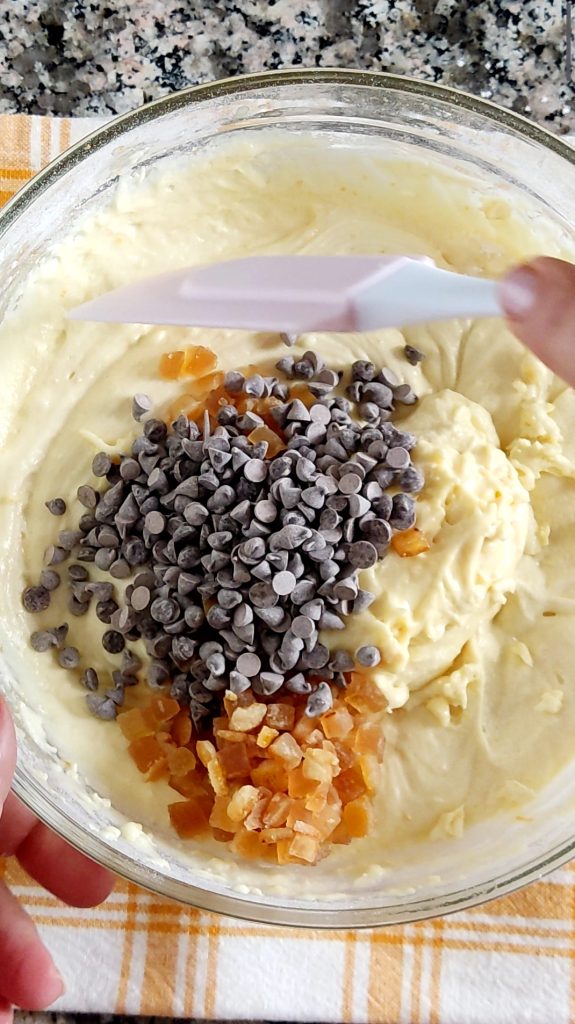 Add the sifted flour and baking powder. Mix well. Finally, add the chocolate chips and the candied orange peel cut into small cubes. Mix the batter well with a spatula.