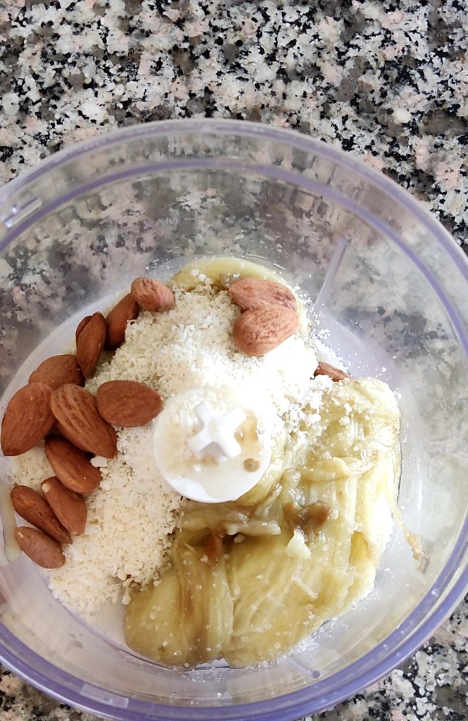• Let the eggplant cool. Cut it in half and with the help of a spoon, scoop out all the eggplant flesh. Transfer the eggplant flesh to a mixer. Add a pinch of salt, the grated Parmesan cheese, and the almonds.