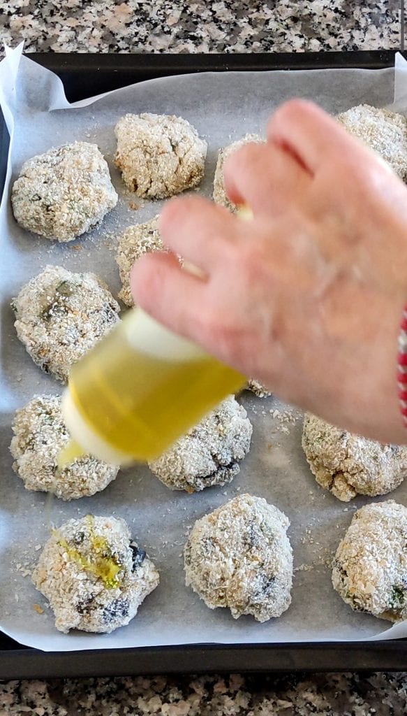 Place the Eggplant Meatballs on a baking sheet lined with parchment paper. Drizzle a little extra virgin olive oil on top.