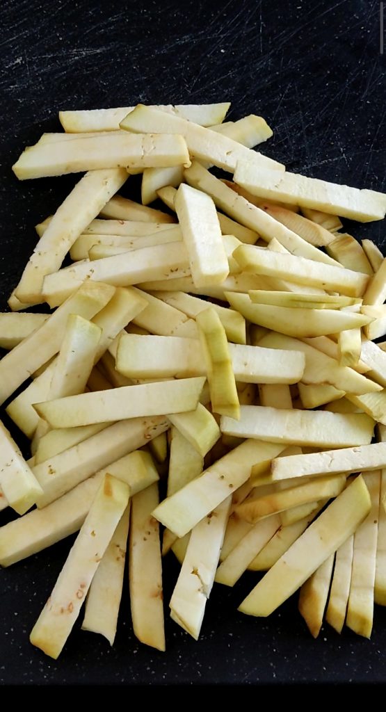 • Clean the eggplants. First, cut them into slices about 0.25 inches thick and then into sticks of the same size. Now prepare the batter. Pour the rice flour into a bowl and also add the baking soda.