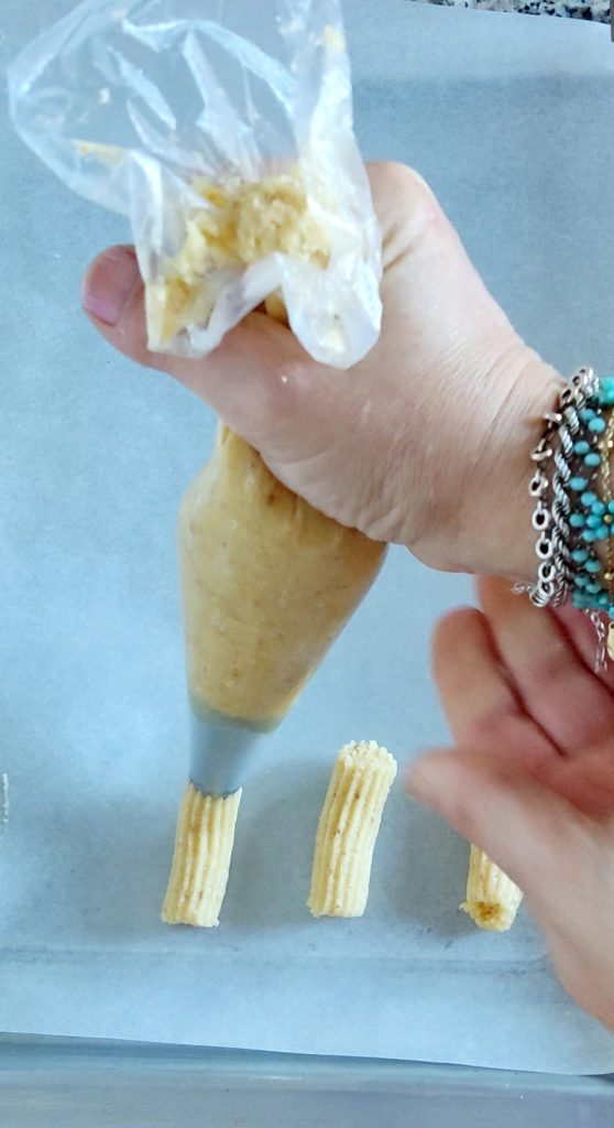 • Transfer the dough into a piping bag with a large star tip. Now form the Cookies: I made sticks placing them slightly apart on a baking tray lined with parchment paper, but you can make them in the shape you prefer.