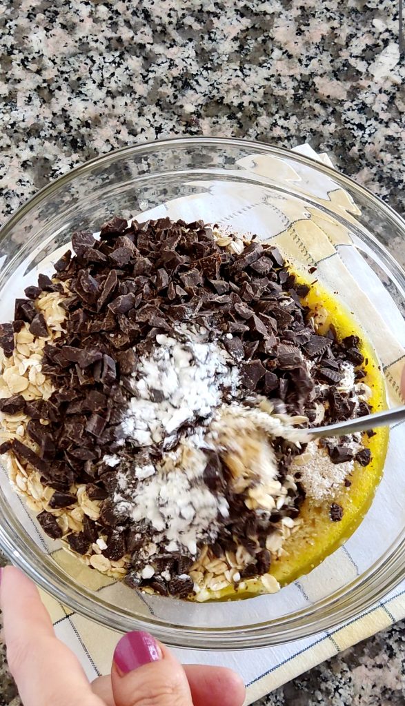 Add the oat flour, oat flakes, and chopped dark chocolate. Continue adding to the dough a teaspoon of baking powder and a pinch of salt. Mix the dough well.