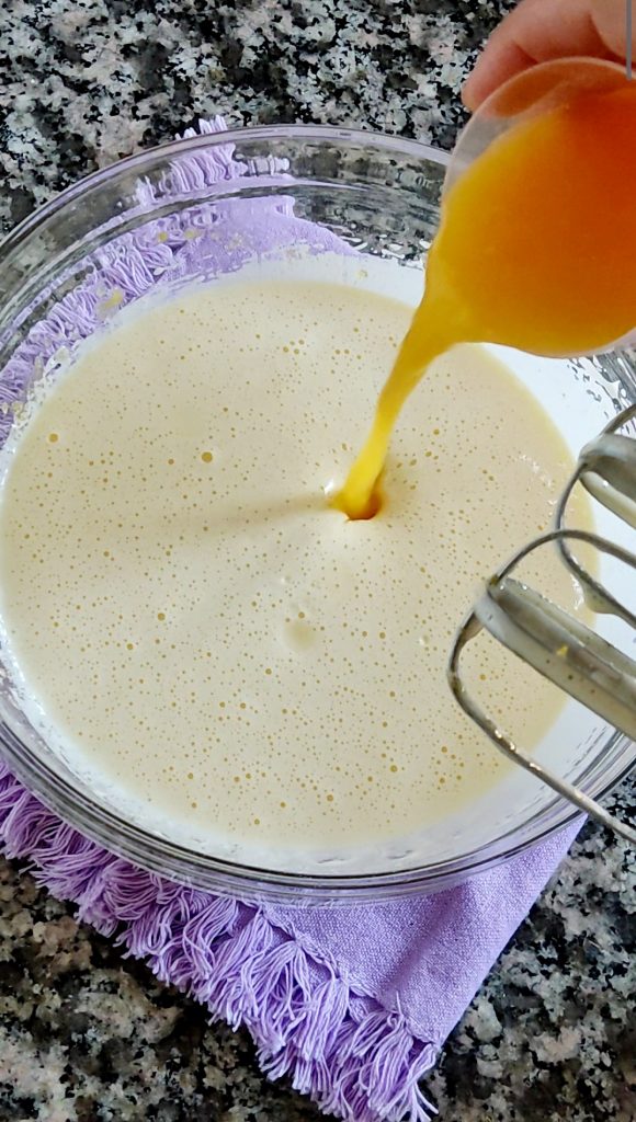 To prepare the Orange Plumcake you need 2 unwaxed oranges to use their peel as well. Wash the oranges well. Grate them to obtain the zest, only the orange part. Squeeze them to obtain the juice. You need about 1/2 cup of orange juice. If it’s not enough, squeeze another half orange.