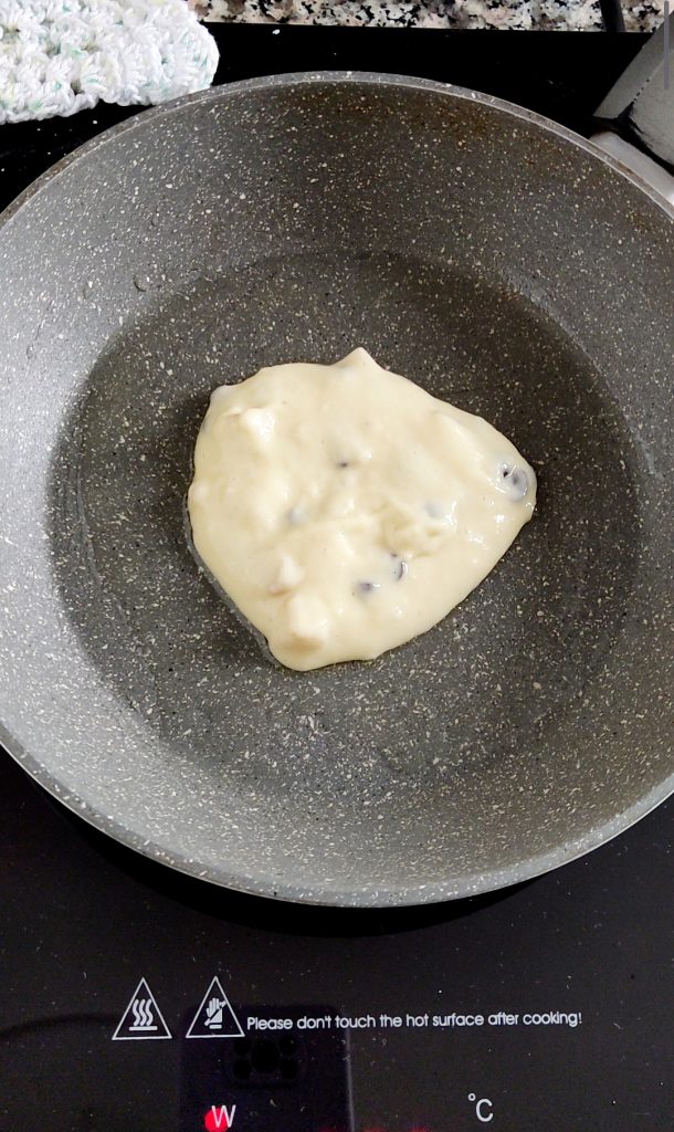 Cover with a lid and cook for 2 minutes over medium heat. When many bubbles form on the surface it’s time to flip the pancake and let it cook on the other side.