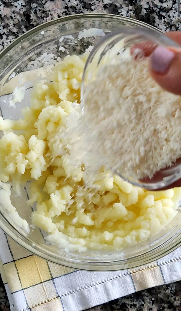 Mash the potatoes with the help of a potato masher in a bowl. Add a pinch of salt and the grated Parmesan. Mix well with a fork.
