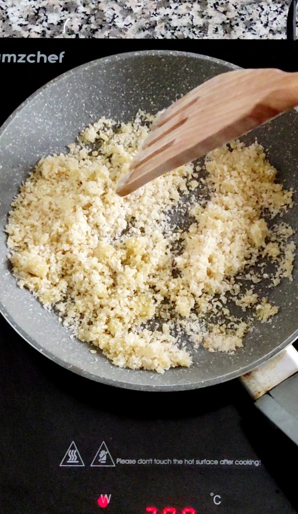 While the pasta is cooking, pour 2 tablespoons of olive oil into another pan, add the breadcrumbs and let it lightly toast for 2 minutes on medium heat, stirring with a wooden spoon.