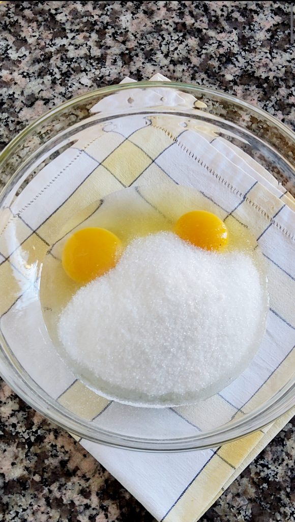 • Wash the peaches, peel them, and cut half into cubes and the others into thin slices. Beat the 2 whole eggs with the sugar using an electric mixer for 8-10 minutes until you have a light and fluffy mixture.