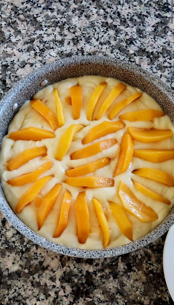 • Finish by adding the peach cubes and simply mixing with a spatula to incorporate them into the batter. Pour the mixture into an 8-inch diameter cake pan greased or lined with parchment paper.