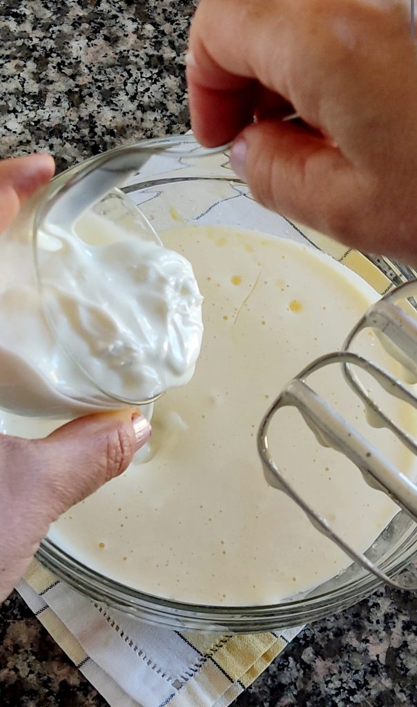 Add the melted butter and a jar of plain or peach yogurt. Mix.