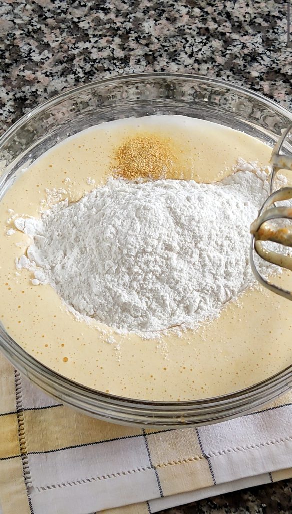Continue by adding the grated lemon zest, the sifted flour, and the baking powder. Mix well.