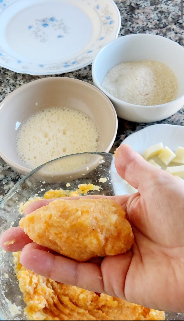 Add a little more of the mixture and close it to form croquettes with an elongated shape. As you prepare them, first dip them in the beaten egg and then in the breadcrumbs, making sure it sticks well all over.