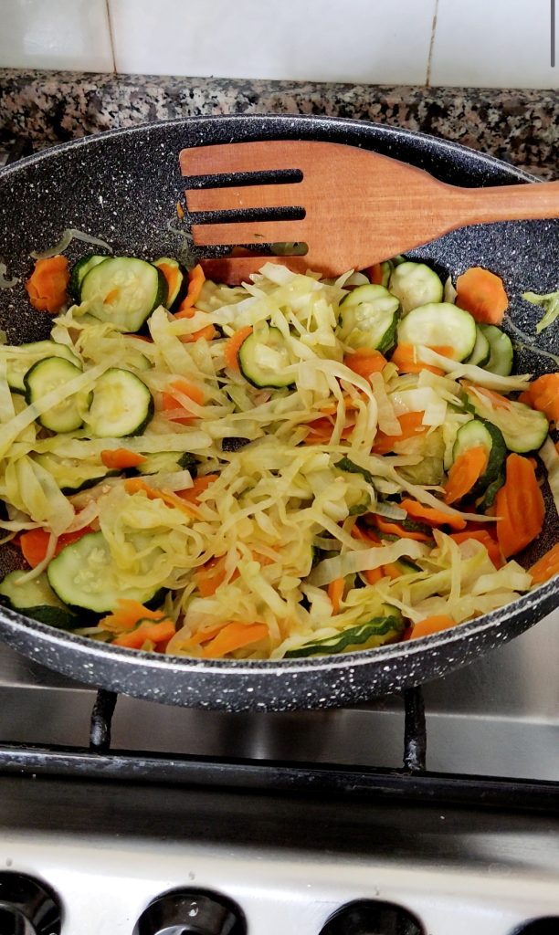 Also slice the onion and cabbage leaves into thin strips. Pour 3-4 tablespoons of olive oil into a wok or a large pan. Add all the vegetables and a pinch of salt. Stir well with a wooden spoon.