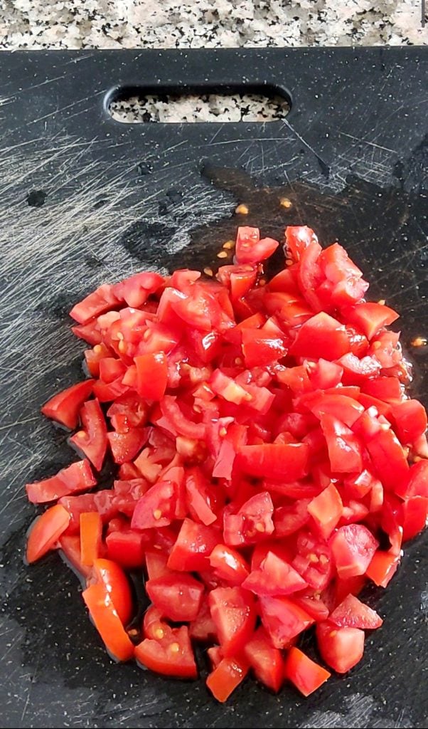 • Wash the cherry tomatoes and cut them into pieces. I used thinly sliced Emmental cheese, but you can use any soft cheese you prefer, preferably one that melts.