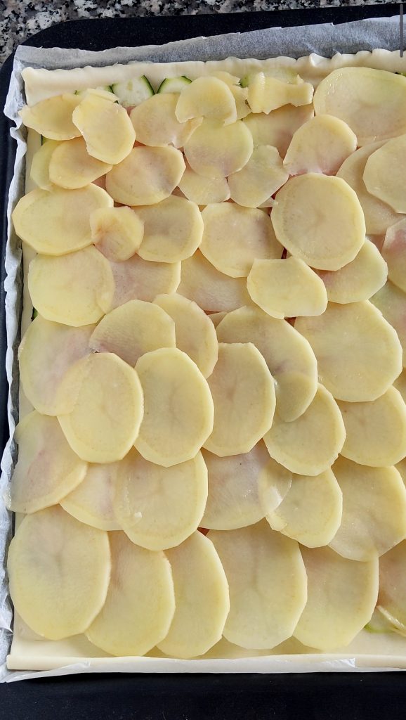 • Lay a rectangular roll of puff pastry in a baking dish lined with parchment paper. Cover the base with the zucchini slices, slightly overlapping them.