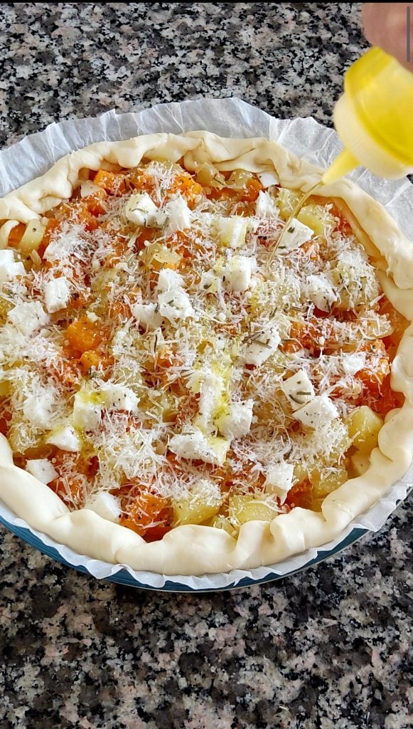 Fold the puff pastry all around. Drizzle with a little extra virgin olive oil and bake the Savory Pie with Pumpkin and Potatoes in a preheated static oven at 375°F for about 30 minutes.