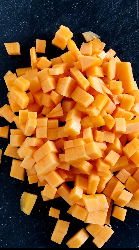 • Clean the pumpkin by removing the skin, seeds, and internal fibers, and cut it into small cubes. Pour 2 tablespoons of extra virgin olive oil, a clove of garlic, and the pumpkin into a pan. Slightly salt and let cook over medium heat for 8-10 minutes, until the pumpkin becomes very soft.
