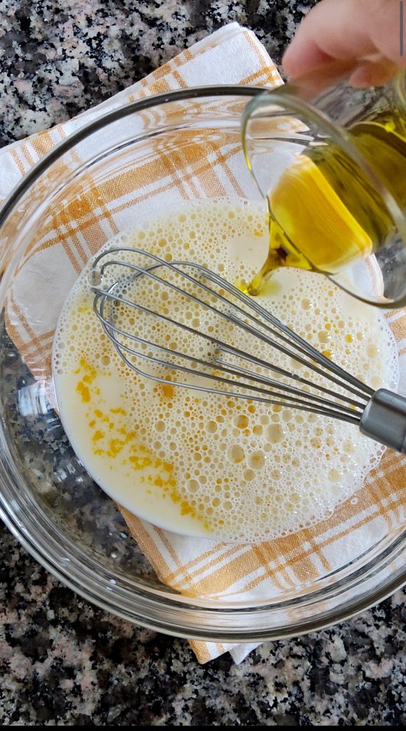 • Add the remaining extra virgin olive oil and mix. Also add the flour and half a packet of instant yeast for savory pies. Mix well with the whisk to obtain a smooth and lump-free mixture.