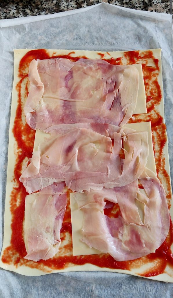 Pour the tomato sauce into a bowl and add a pinch of salt and oregano, mix. Unroll a rectangular puff pastry sheet on the work surface.
