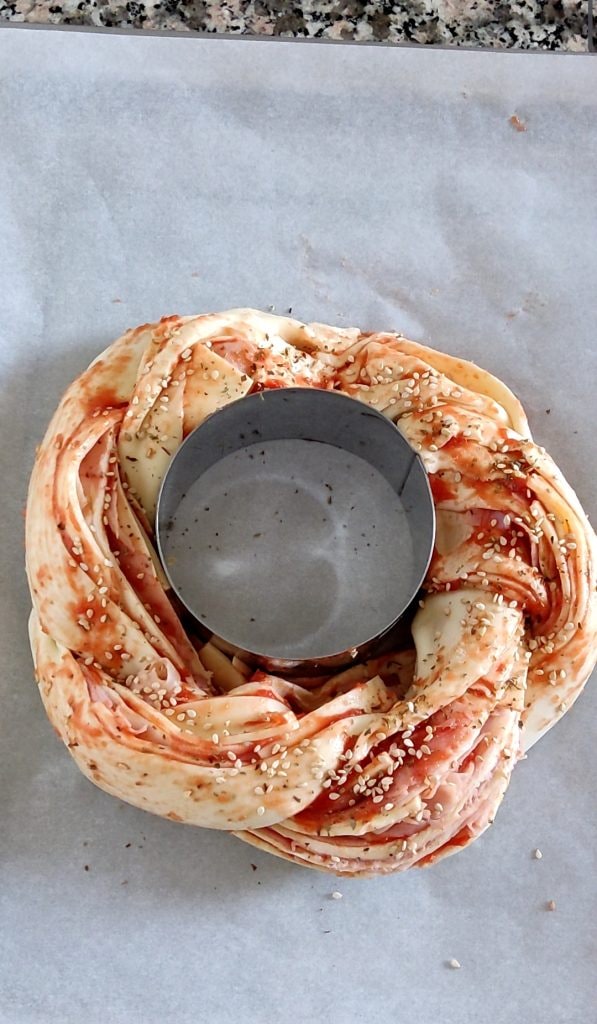 *If your family is large and you want to make a bigger one, just use 2 sheets of puff pastry, prepare 2 filled rolls, and make a larger Wreath by joining the two stuffed braids