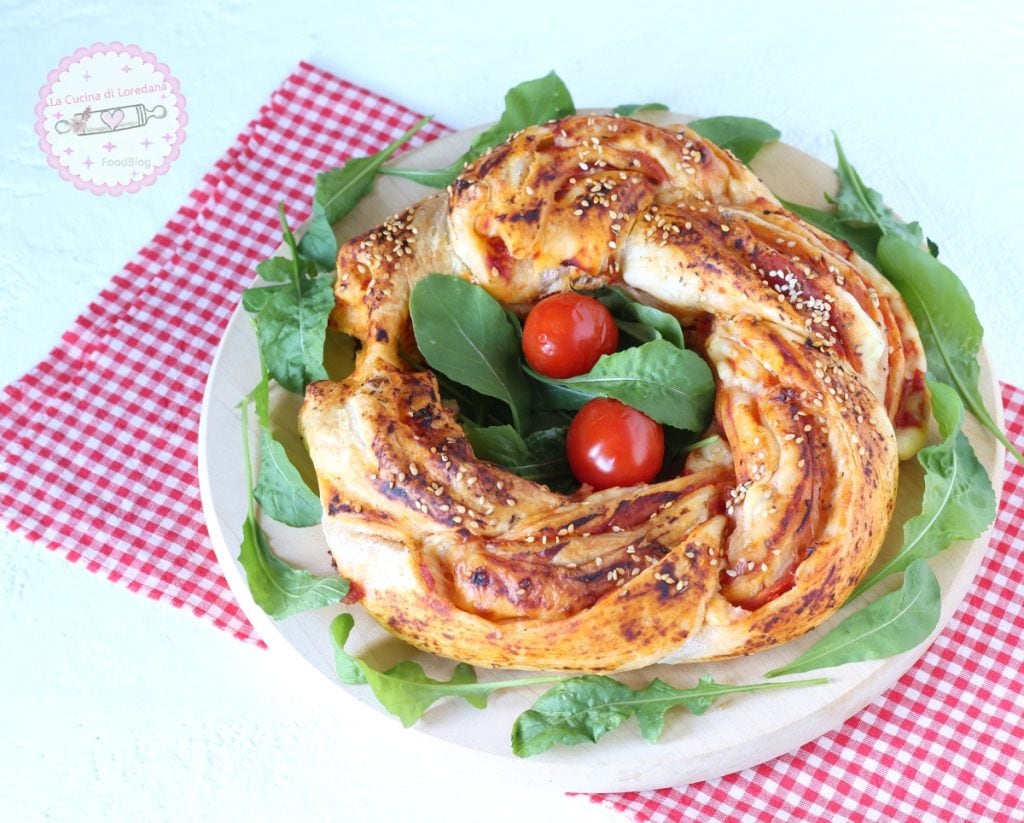 Savory puff pastry wreath with tomato, cooked ham, and scamorza cheese. The recipe I want to tell you about today is of a savory pie perfect as a centerpiece for the holidays. A rustic braid filled with tomato, slices of cooked ham, and plenty of sliced scamorza cheese, a truly tasty and flavorful recipe. With just a few simple steps, I turned a filled puff pastry roll into a delicious and special puff pastry wreath that will also stand out as a centerpiece on the Christmas table. A simple and perfect idea that will win over friends and family with its goodness. I also recommend reading the recipe for my Puff pastry tree with spinach and ricotta. I advise you to note down this recipe immediately and don’t forget to let me know if you make it and if you liked it. So, let’s hurry to the kitchen and prepare the Savory puff pastry wreath together