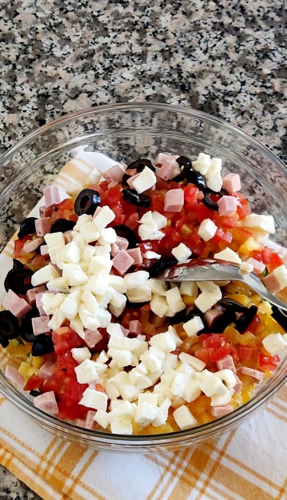 Cut the cooked ham and mozzarella into small cubes. Drain the corn. Cut the pitted black olives into rings. Wash the red and yellow cherry tomatoes. Cut them into small pieces, removing the seeds and internal liquid.