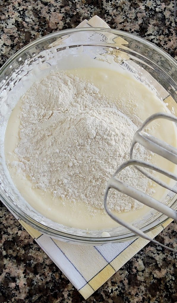 Add a jar of plain yogurt and the melted butter. Mix. Continue by adding the grated zest of half an untreated lemon, the sifted flour, and the baking powder.