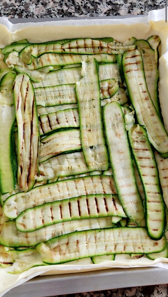 Place the rectangular puff pastry roll in a baking pan lined with parchment paper. My baking pan measures 8.6 x 11 inches. Prick the bottom with a fork. Arrange the grilled zucchini slices, slightly overlapping, on the puff pastry base. Cover with slices of scamorza cheese or another soft melting cheese.