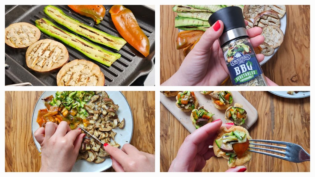 The BASKETS WITH GRILLED VEGETABLES are a quick and tasty idea to serve at the table. With a few ingredients, you can prepare a simple yet delicious recipe, perfect to be enjoyed as an appetizer or even to prepare for a dinner with friends on the terrace. The stars of this dish are definitely the grilled vegetables, such as zucchini, peppers, and eggplants, which once grilled, are seasoned with the intoxicating aroma of BBQ VEGETABLES LA DROGHERIA 1880, a combination of aromatic herbs like basil, along with the more decisive taste of black pepper, the perfect mix to enhance the flavor of grilled vegetables. The mix of herbs and spices is stored in a glass jar and with the adjustable Premium Grinder, it is also fun to use; you can also bring it to the table because it is very nice to show. Follow me in the recipe to prepare these delicious puff pastry baskets with grilled vegetables, success at the table is guaranteed!