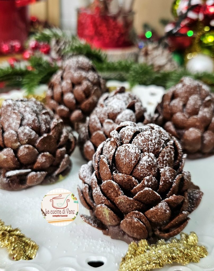 They are made with only 4 ingredients, require no baking and hide a soft center of pistachio cream or Nutella: little treats that look like real Christmas pinecones, crunchy on the outside thanks to chocolate cereals and soft inside.
