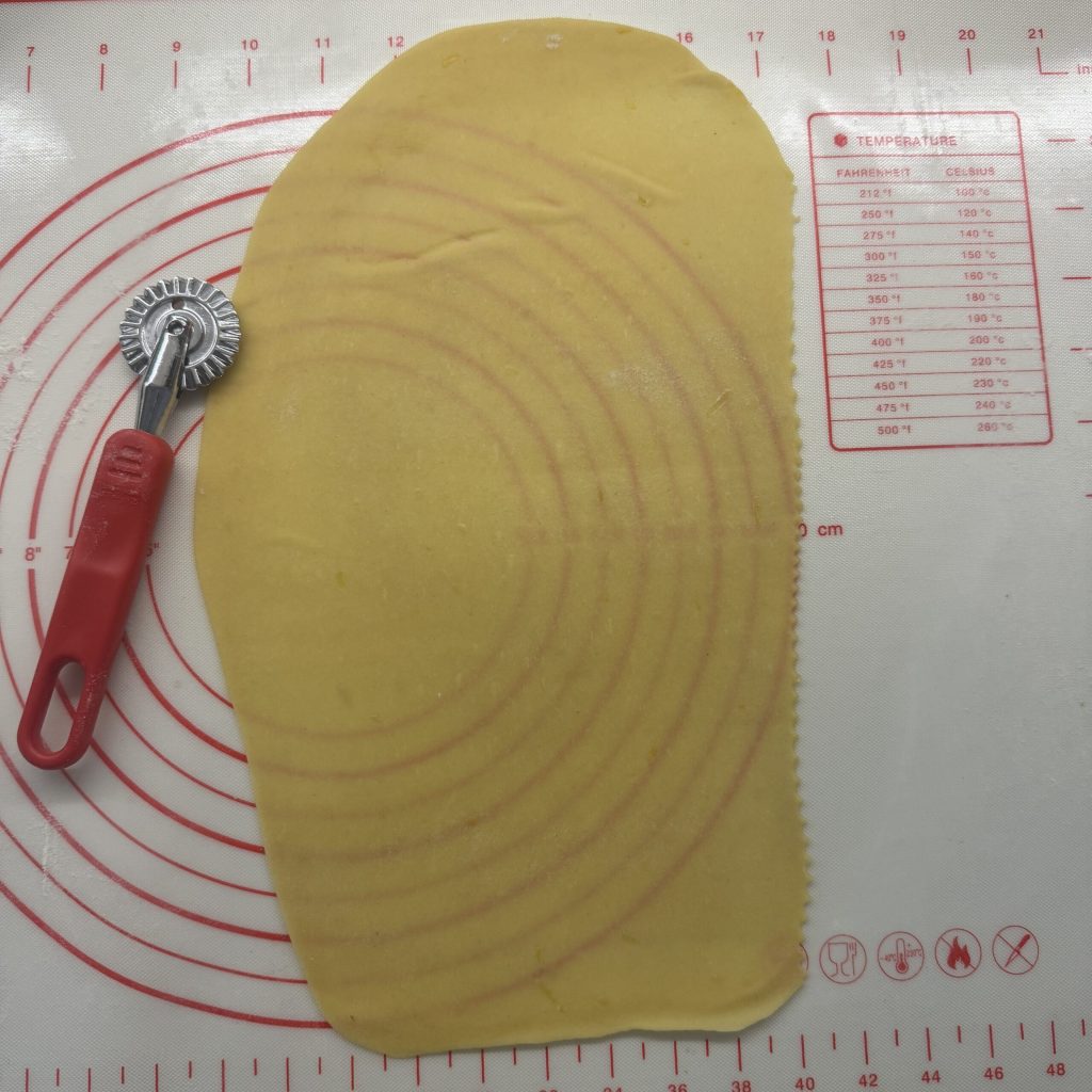 If you use a rolling pin, roll it out very thinly. You should get an almost transparent sheet. If instead, you use a pasta machine, run the dough through several times, gradually moving to the thinnest setting, until you reach a thickness of 1 mm.With the pastry wheel, create squares of about 4 inches per side and make two cuts in the center to allow moisture to escape more quickly from the dough. You can re-knead the trimmings or simply make slightly irregular chiacchiere.