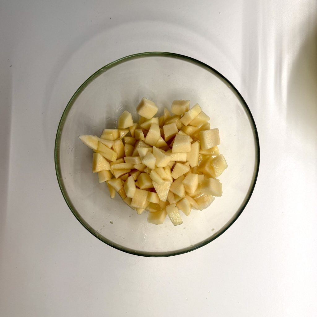 Cut 2 pears into cubes and insert them into the bowl: 30 sec. Reverse speed Soft. If the pears are ripe, I recommend transferring the mixture to a bowl and adding them manually with a spatula, as they may disintegrate in the Thermomix.