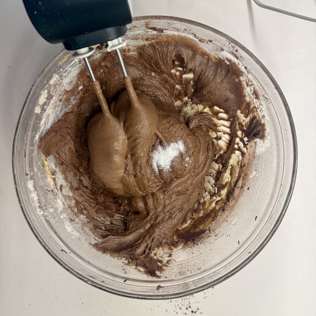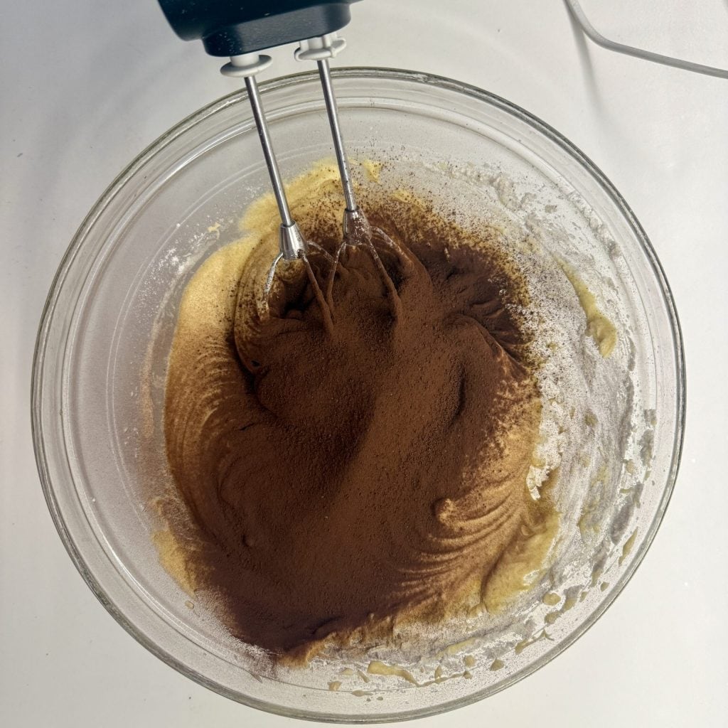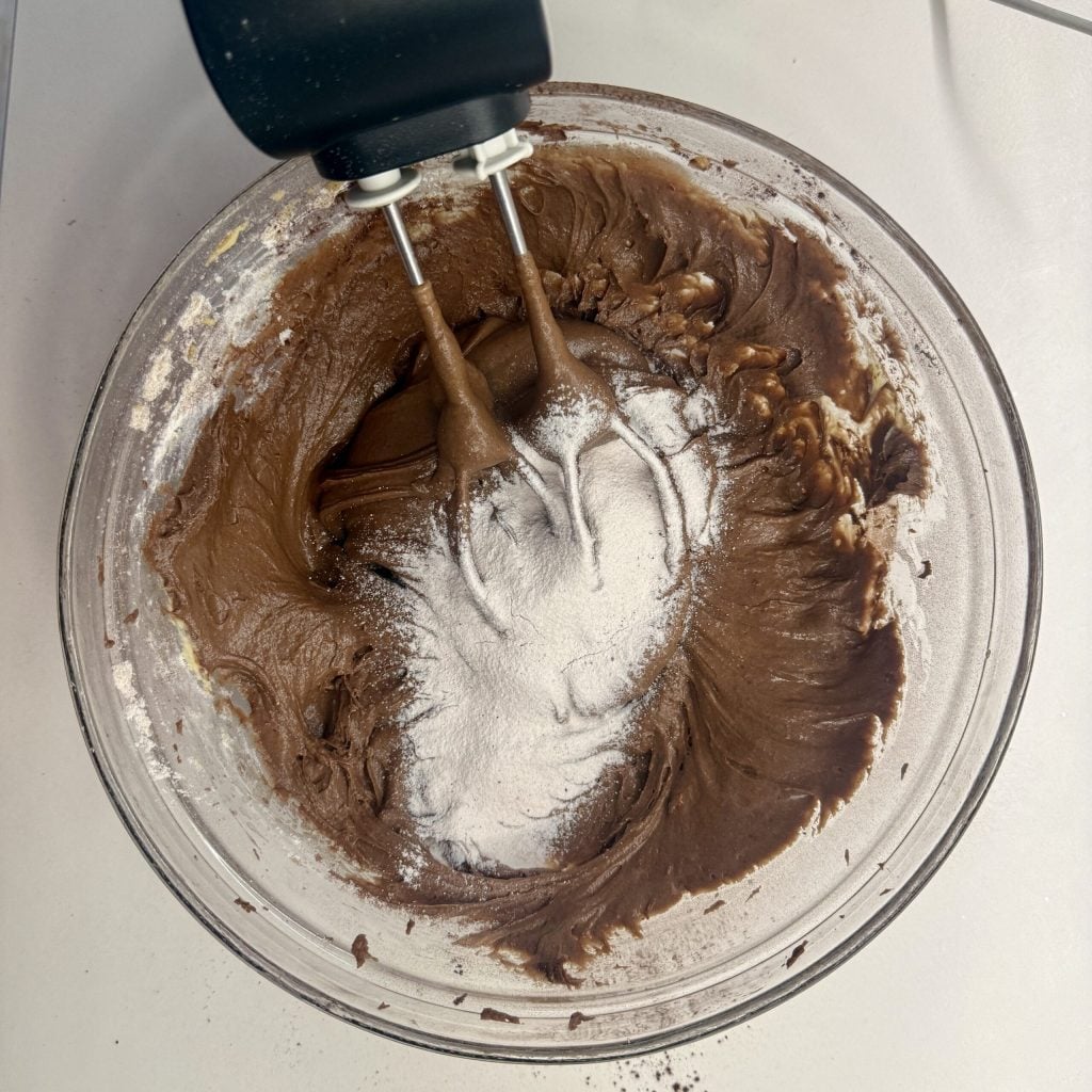 Add the vanillin, cocoa powder, and sifted baking powder: 40 sec. speed 3-4.