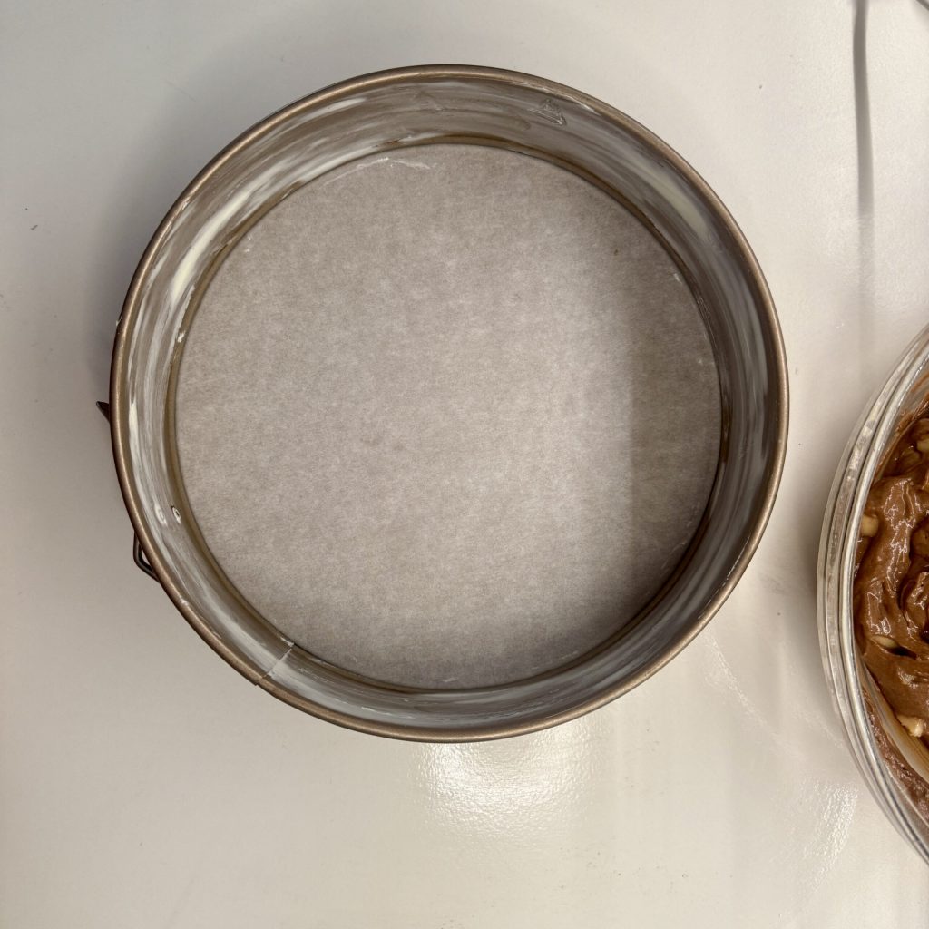 Line the bottom of a 9.5-inch cake pan with a sheet of parchment paper and butter the edges of the pan.