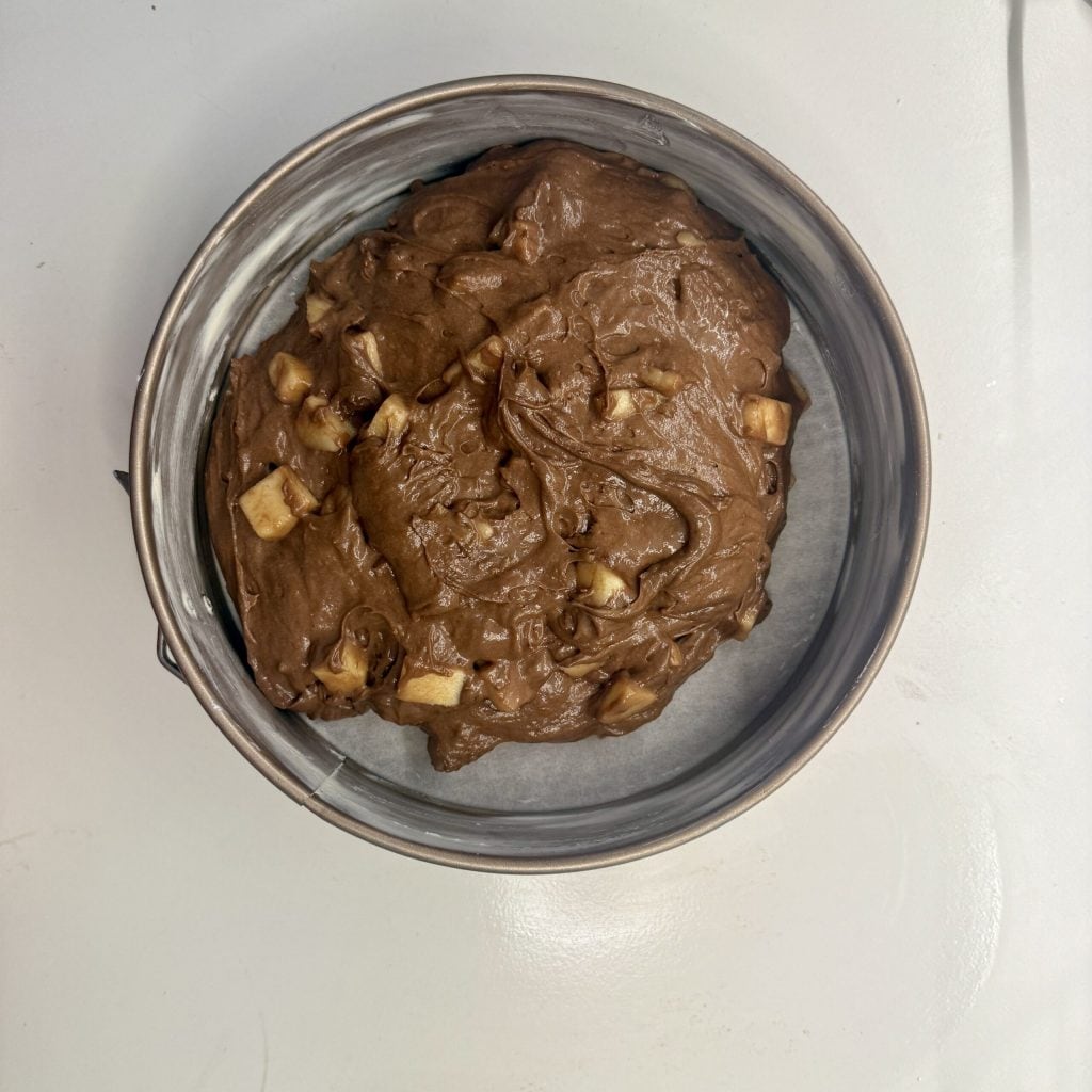 Line the bottom of a 9.5-inch cake pan with a sheet of parchment paper and butter the edges of the pan. Pour the batter and level the surface with the spatula.